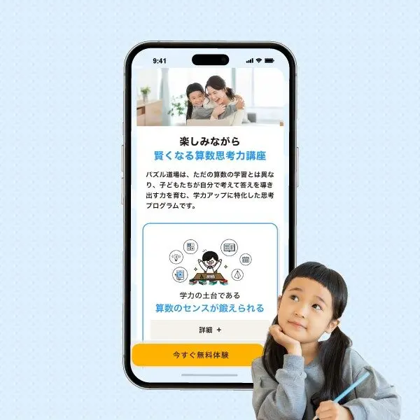 パズル道場オンラインは、全国2500教室以上に導入されている「考える力」を育てる算数講座の家庭学習版です。図形・数の感覚を鍛えながら、論理的思考力や空間認識力を自然に伸ばすトレーニングが可能です。